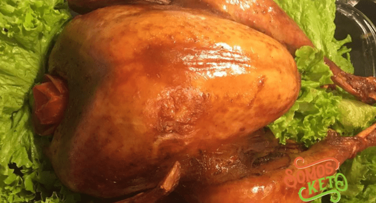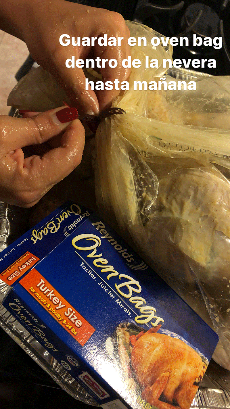 Al día siguiente. Calienta el horno a 350 grados. Coloca el pavo en el horno a fuego lento 300 grados F por dos horas dentro de la funda de hornear para asegurar que absorba los jugos. Luego quita la funda con los jugos. Usa sus jugos para el gravy. Rostiza a 400 grados sin la funda de hornear y exprime media naranja agria sobre la piel para que quede tostada. En 30 minutos debes tener un pavo doradito y bien jugoso. Si tu pavo es muy grande coloca un termómetro dentro de la pechuga para asegurar que este en 180 grados F por dentro antes de sacarlo del horno asegurando su cocción.